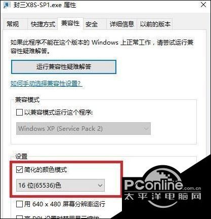 4、接着切换到兼容性选卡,修改快捷方式文件,使其16色(65535)运行如下图所示: