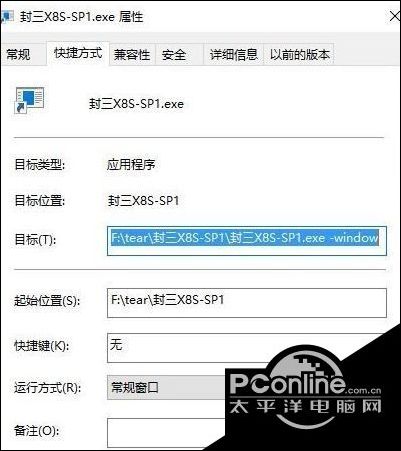 3、在快捷方式中,填加窗口化参数 在目标的exe后面加上 空格-window ;
