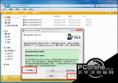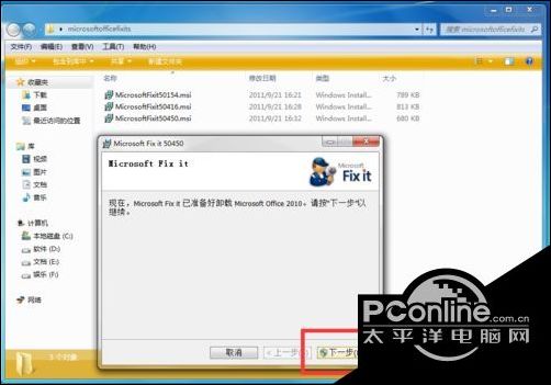 3、我们需要卸载office2010,所以选择“MicrosoftFixit50450.msi”软件,双击“MicrosoftFixit50450.msi”,打开软件后按照提示进行选择;
