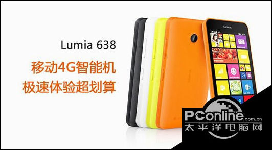 Lumia 638采用4.5英寸854×480分辨率IPS屏幕,搭载1.2Ghz高通400四核处理器,运行1GB内存,搭载后置500万像素摄像头,支持TD-LTE、TD-SCDMA、WCDMA、GSM频段网络,支持移动4G网络,售价仅599元。
