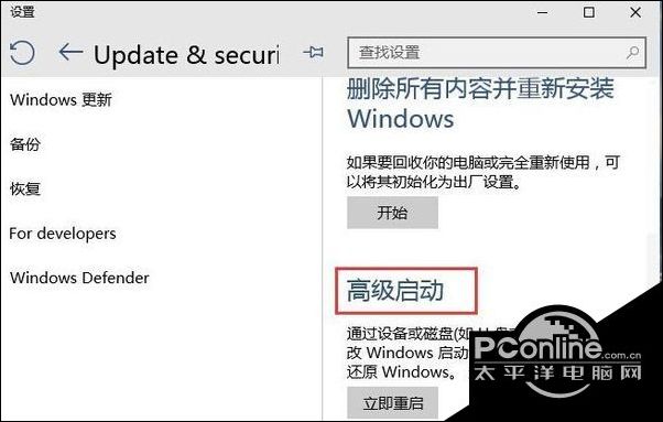 3、然后选择“恢复”,并点击高级启动下方的重启按钮;