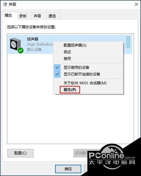 2、切换到【播放】选卡,在下面的【扬声器】上单击右键,选择【属性】;