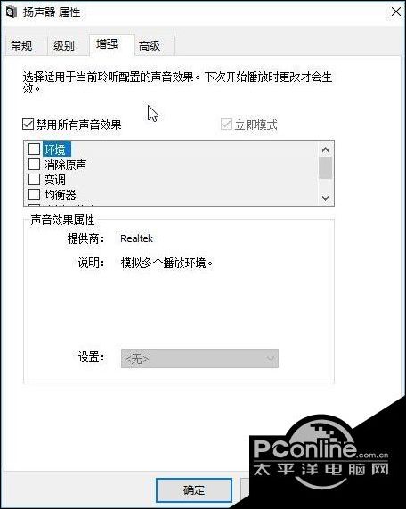 3、切换到【增强】选卡,勾选【禁用所有声音效果】点击确定即可。