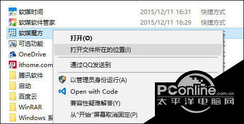 3、在打开的开始菜单目录中找到魔方快捷方式,右键单击—打开文件所在的位置,如下图所示: