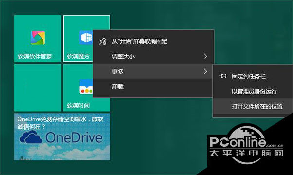 2、右键单击软媒魔方磁贴—更多—打开文件所在位置,如下图所示: