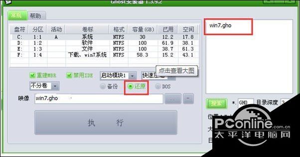 5、右侧列表点击win7.gho,其他按默认选项,点击执行, 计算机 重启开始还原进行安装,耐心等待安装结束进入桌面即可。