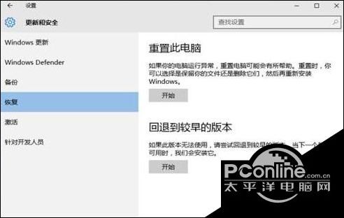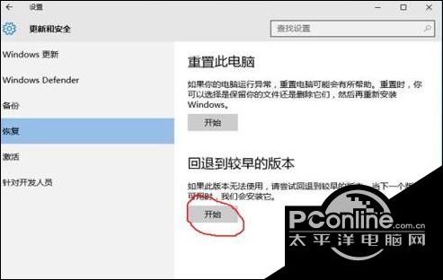 选择恢复后,右方有两个选择,一个为重置此 电脑 ,这一项是为重装win10使用的,二为回退到较早的版本,就是我们此行的目的,选择下方的开始。