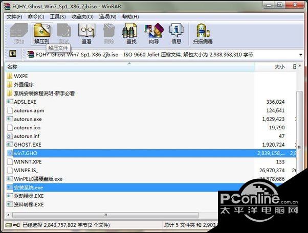 2、按ctrl键,分别单击安装系统.exe和win7.gho,点击解压到;