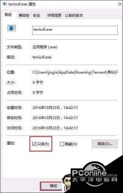 6、然后右键覆盖后的teniodl.exe文件,点击属性,在属性选项卡中把文件权限改成只读;