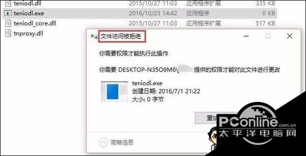 8、运行这个命令之后teniodl.exe文件也就无法删除了,如图所示没有任何权限删除文件。要撤销的话就运行:cacls“路径”/Geveryone:F允许所有人操作该文件。