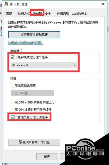 从打开的“腾讯QQ 属性”窗口中,切换到“兼容性”选项卡,勾选“以兼容模式运行这个程序”项,同时设置相应的 系统 (通常可选择Windows8),点击“确定”按钮。