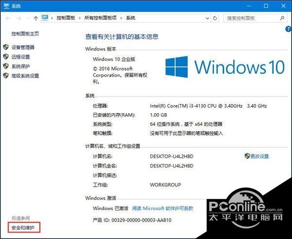 2、在打开的属性界面点击左下角的【安全和维护】选项;