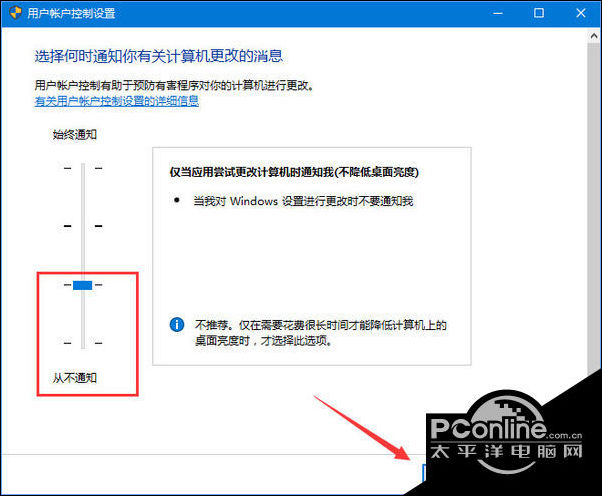 4、在弹出的界面中在用户账户控制有助于预防有害程序对你的计算机进行更改 下面将滑块一定到最下面或倒数第二个,点击【确定】即可。