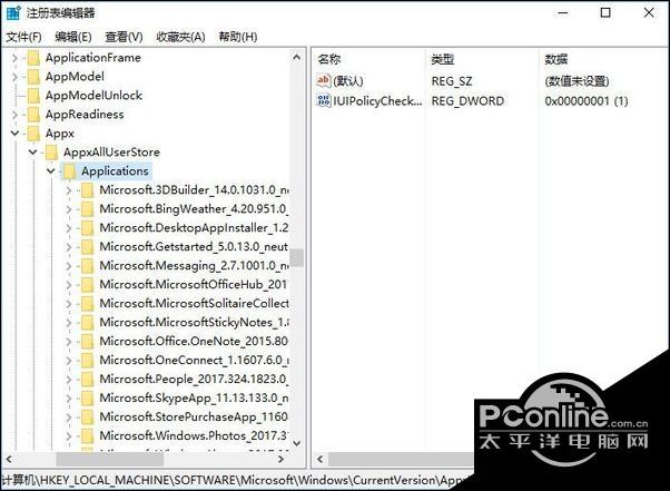 5、在注册表中依次展开:HKEY_LOCAL_MACHINE\SOFTWARE\Microsoft\Windows\CurrentVersion\Appx\AppxAllUserStore\Applications