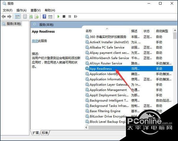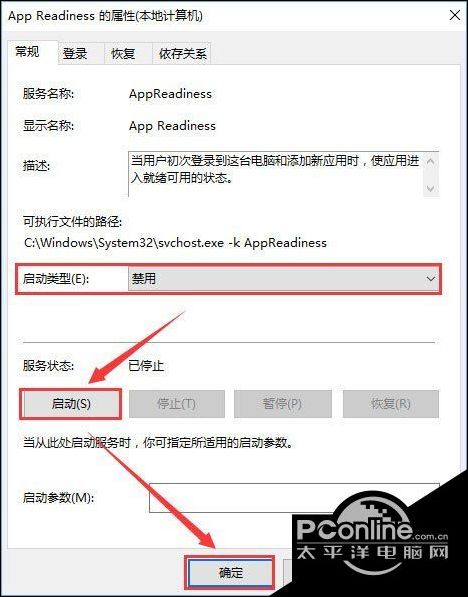 2、在服务列表找到App Readiness服务,从描述中可以看到该服务与用户登录有关。双击该服务项,打开属性窗口,首先停止该服务,然后把启动类型设置为“禁用”,如图: