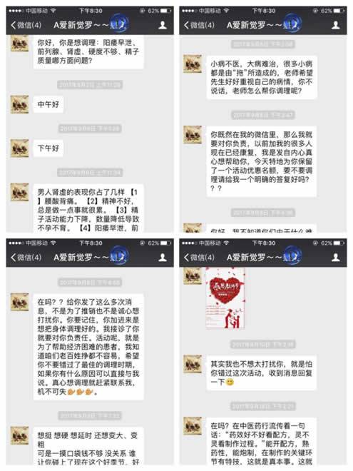 但是我对他还抱有一丝希望,所以我忍了两天,正打算联系他咨询一下产品,没想到我的小号消息快爆炸了,这老中医给我发了很多消息,这些消息我一看就知道是提前写好的“话术”,而且既然你那么牛逼,为什么有那么多的时间来主动找我?