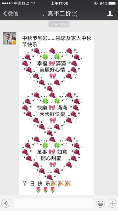 所以你发了也是无济于事的,起不到任何作用,实在手痒想发,可以真心编辑一条,以第一人称语气去发,比如:祝你XX节日快乐,简单一句也比你发那种花哨的文案好很多,至少看起来不像是群发的。