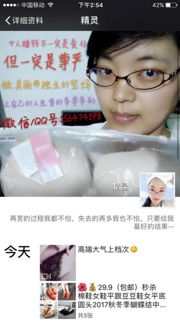 其次依然是刷屏的问题,现在传统傻逼微商不刷屏的确实很少。封面拿的是内衣,朋友圈发的是鞋子,很明显之前是卖内衣的,然后卖的不好,改卖鞋子。
