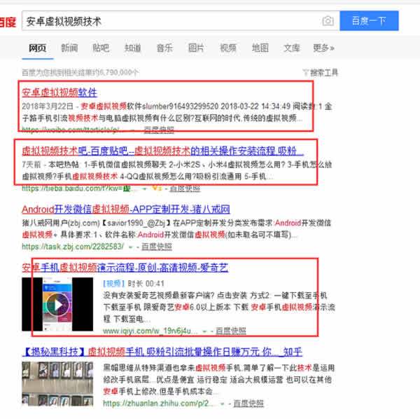 比如以下关键词“安卓虚拟视频技术”这个词,目前有贴吧主页排名,微博排名,爱奇艺视频排名,总共三个如下图: