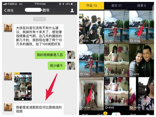 包括我猫客会有一个朋友,也用同样的方式在抖音上引精准流量,他做的是减肥产品,他那边操作了十来天,一共出了两个爆款,都是十多万的播放,加了130个减肥好友,而这两个爆款正是发减肥前后对比图带来的推荐量,其它的伪原创视频只有几千的推荐量。