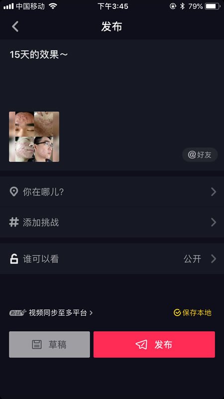 然后视频的封面尽量选一张清晰点的,最后一步“说点什么”这里不要带上任何敏感词,最好是简短一些,你写的内容越多,敏感词越多,就会越容易触犯平台规则。比如你发的是客户前后效果对比图照片电影,那你直接写一句:15天的效果就可以了。