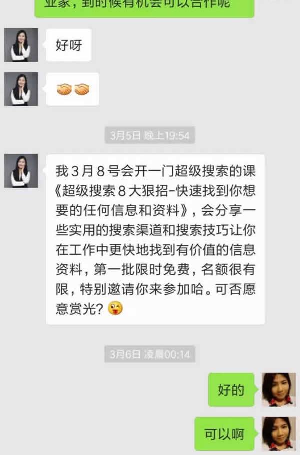 而且还会让我觉得非常惊喜,因为她说了,是特意邀请我,本来很有价值的信息资料,免费送给我,这足以打动我了!!!——这要比很多人在做微信群发个人推广时,直接就发引导话术+推广海报,效果要好一百倍!