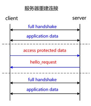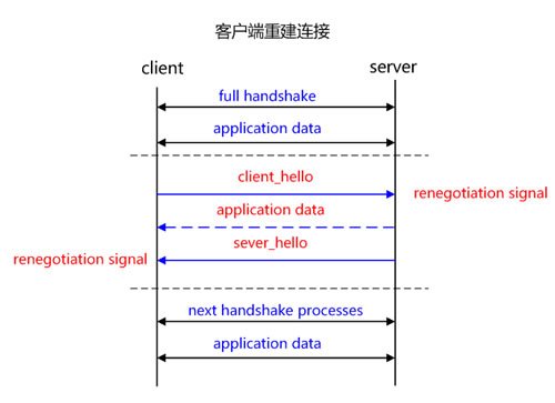 重建连接 renegotiation 即放弃正在使用的 TLS 连接,从新进行身份认证和密钥协商的过程,特点是不需要断开当前的数据传输就可以重新身份认证、更新密钥或算法,因此服务器端存储和缓存的信息都可以保持。客户端和服务器都能够发起重建连接的过程,当前 windows 2000 & XP 与 SSL 2.0不支持。