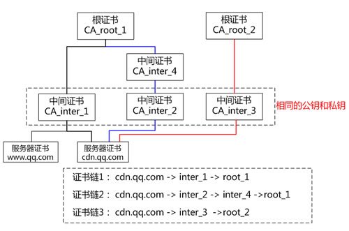 如 CA 根证书和服务器证书中间增加一级证书机构,即中间证书,证书的产生和验证原理不变,只是增加一层验证,只要最后能够被任何信任的CA根证书验证合法即可。