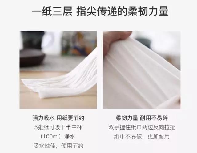 网易严选在描述一款面巾纸时,就用了“一纸三层”这种具象的文案,来表达纸张柔韧这一特点,用“5张纸可吸干半中杯(100ml)净水”,来体现“强力吸水、用纸更节约”的优点,没有复杂、专业的词汇,就将产品的特点描述清楚。