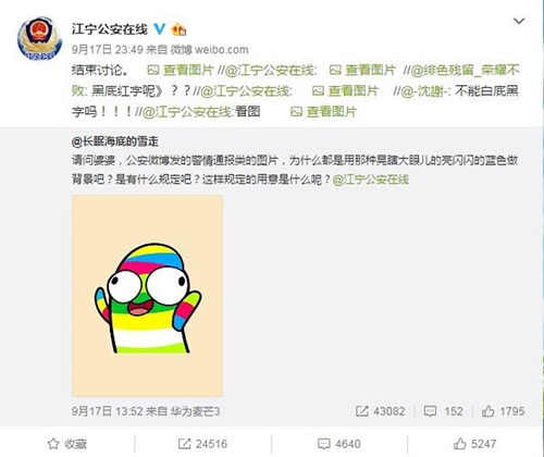 那么为啥不用其他背景色呢?网络知名公安@江宁公安在线,用实例为大家证明其他配色不是看不清,就是亮瞎眼,还真的不适合。