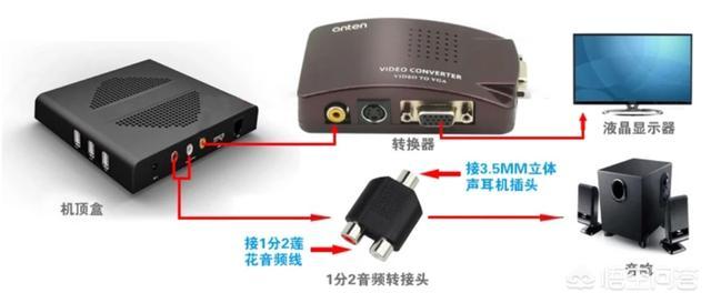 通过这个转接器,就可以把电视机顶盒输出的AV视频信号转换为VGA信号,通过VGA信号线接到液晶显示器对应的接口上就可以了。但这个只有图像,声音需要另外配个小音响播放,接线示意见下图
