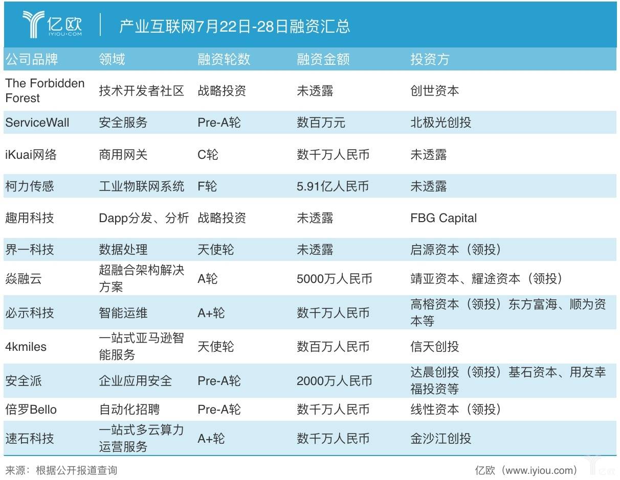 本周共有12个产业互联网相关项目获得新融资,包括:The Forbidden Forest、ServiceWall、iKuai网络、柯力传感、趣用科技、界一科技、焱融云、必示科技、4kmiles、安全派、倍罗Bello、速石科技。分别分布于技术开发者社区、安全服务、商用网关、工业物联网系统、Dapp分发分析、数据处理、超融合架构解决方案、智能运维、一站式亚马逊智能服务、企业应用安全、自动化招聘、一站 式多云算力运营服务等领域。