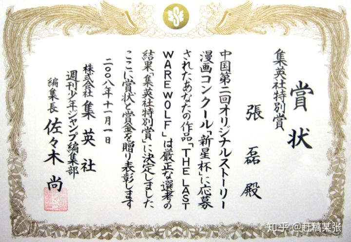 集英社特别奖奖状,和按照日本新人奖规格一摸一样