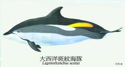 (73.大西洋斑纹海豚。和真海豚正相反,大西洋斑纹海豚的黄色斑块位于身体后方。特别喜欢跳跃,又被称为跳跃海豚。在北大西洋广泛分布)