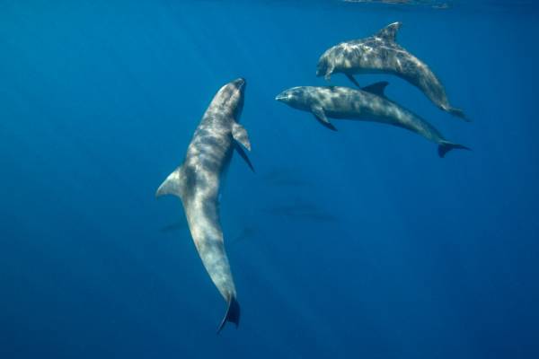(71.里氏海豚。非常容易辨认,身上会留下各种疤痕,不知道是同种海豚打斗造成,还是捕食鱿鱼造成,这种疤痕在里氏海豚身上非常普遍。成年里氏海豚颜色会变得很深或很浅,深色的会有点像领航鲸,浅色的会有点像白鲸,上图很好的表现了这一特点)