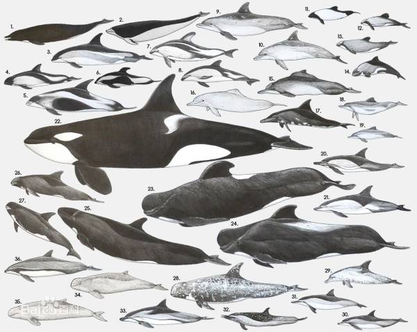 - 海豚科:你们要的大明星来了。海豚科是鲸目最大的一科,有三十多种(具体种数一直有争议,比如真海豚又可以分为短吻真海豚和长吻真海豚,本帖我们按照 32 种的分类方法来计算,而下图是按照 36 种的方法来计算),除了我们常在海上乐园见到的“太平洋瓶鼻海豚”之外,还包括虎鲸这样的巨星。
