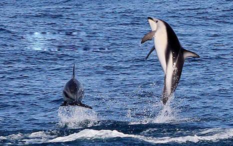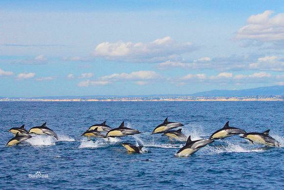 (54.真海豚。古铜色的色斑让真海豚十分靓丽扎眼。真海豚变种极多,体型差距也很大,长度从一米多到两米多都有,许多分类学家都建议将真海豚分为好几种不同的海豚,尤其被广泛认可的分类方法是分为短吻真海豚和长吻真海豚。真海豚分布广泛,除了两极海域外到处都有发现,它也是数量最多的鲸豚类动物,总量可能达到几百万头)