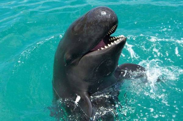 (49.小虎鲸。个头不大,一米多长,但是攻击性很强,有过多次袭击人类的记录,甚至经常追逐捕猎捕自己大的海豚。白色的嘴唇是识别的标志。)
