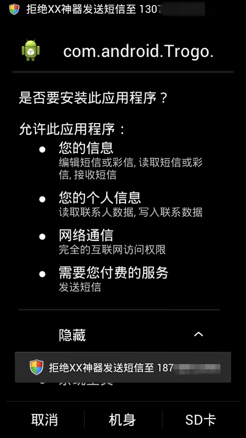 第一,很多人的习惯就是安装之前完全不看看程序的权限,拿来就安。你难道不觉得一个能够发送短信的程序很可疑吗?它并不是第三方短信软件。这样你也敢安装?