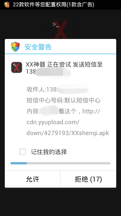 同意读取联系人数据后,XX 神器就会请求发送短信。我想再小白发现这个之后也不会点同意的。
