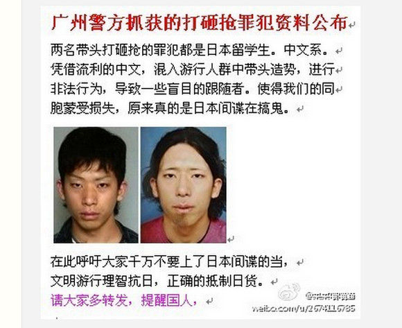 4。在2012年9月16日开始的北京、上海、西安、济南、南京、广州等地的反日大游行期间,在新浪微博上流传着一个帖子: