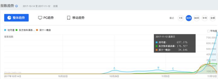 这明明是一个20多分钟的年会短片,为双十一造势而已。所谓的电影上映,不过是包几个特定场次给特定观众免费看短片,票想买也买不到...但在阿里强有力的包装策划下,在传播上完胜同期的院线大片,百度指数和微信指数都已打爆。