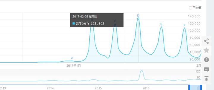 但“民族融合”的效果如何呢?从百度指数上看,谭晶的“民族融合”并没帮到《歌手2017》,《歌手2017》的百度指数巅峰值仅为123802(十万级),比《蒙面唱将猜猜猜》的巅峰值11506014(百万级),差得可不是一点半点。