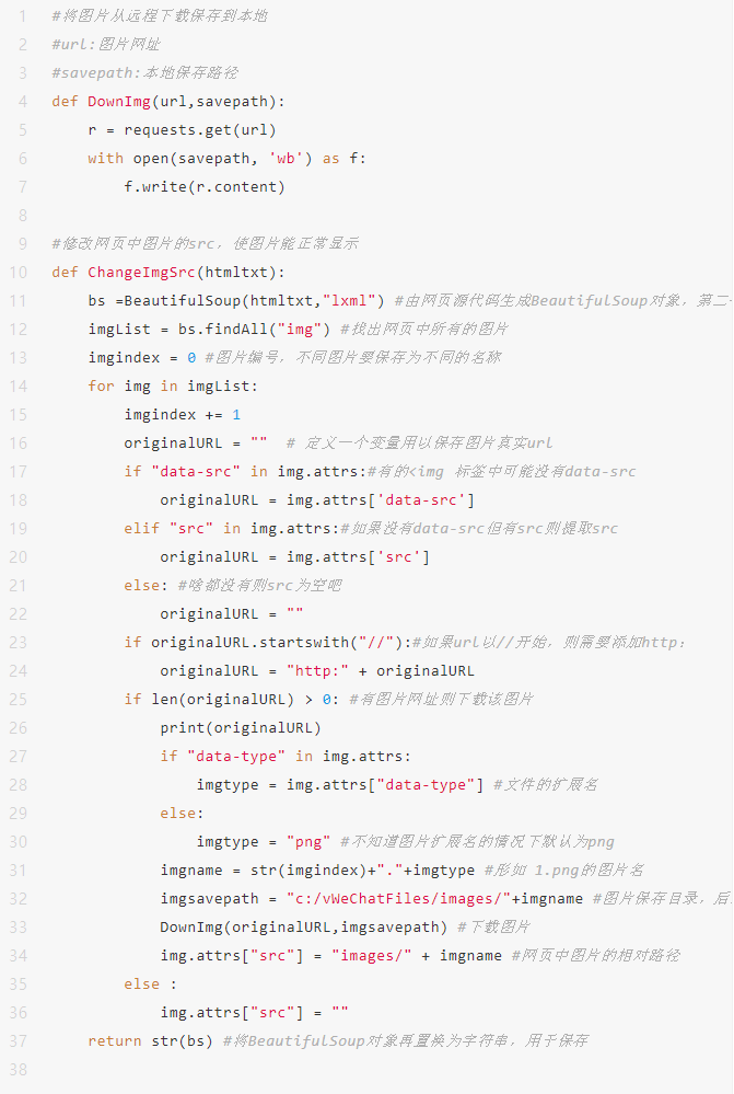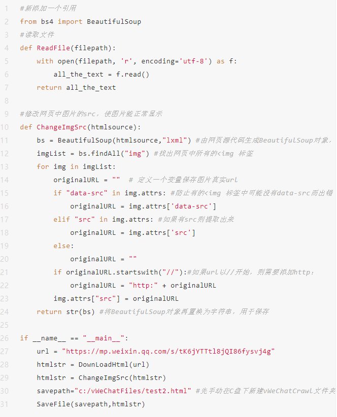 注意第21行,有的图片会以 //http://res.wx.qq.com开头,需要换成常见的http://res.wx.qq.com 形式开头,否则本地打开网页时这些图片会无法正常加载。至于为什么会有 // 开头的网址您可以自行百度。