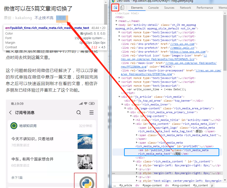 但是,这些原始代码跟开发者工具中 Elements 中显示的,即下图右侧显示的格式化的网页代码可能不一样。比如下图箭头所指位置的“1周前”,虽然你在右侧的源代码中也看到了“1周前”,但是在最原始的代码中此处并没有“1周前”。