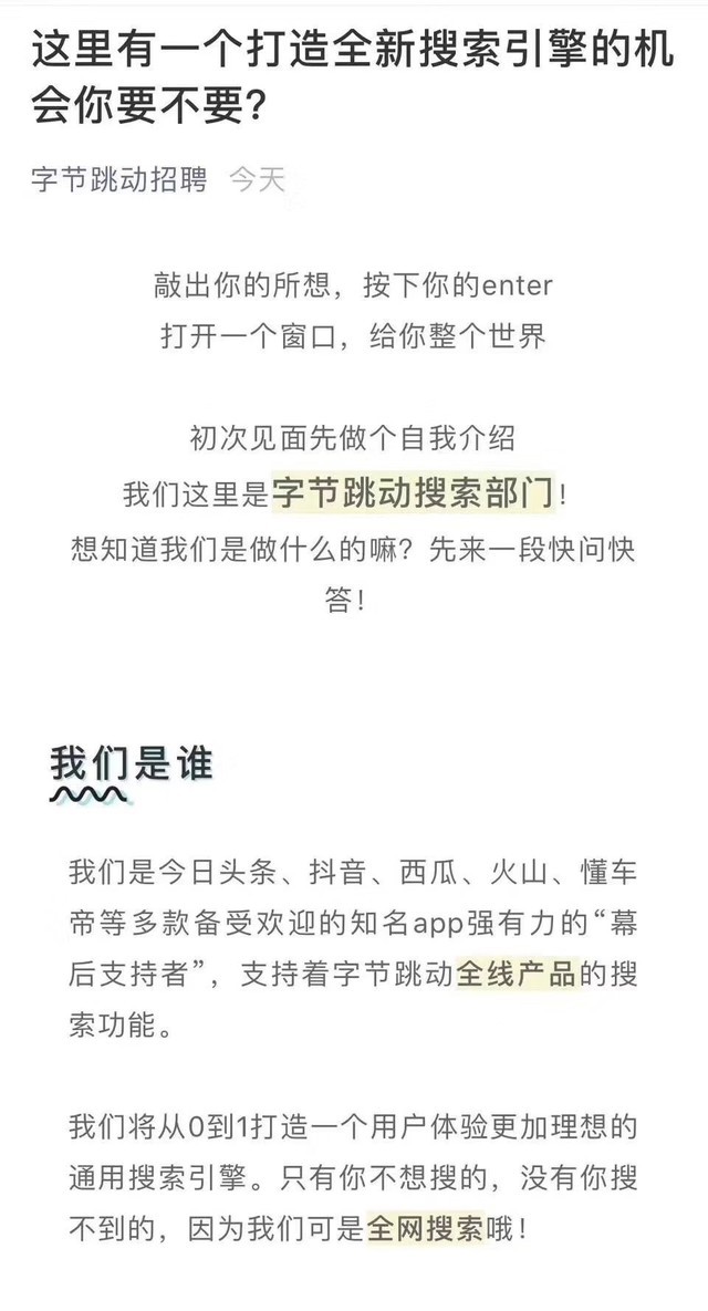 搜索团队还涵盖了字节跳动的推荐、广告、IR、NLP、CV等技术,而这都将是今日头条、抖音、西瓜、火山、懂车帝等多款App强有力的“幕后支持者”。