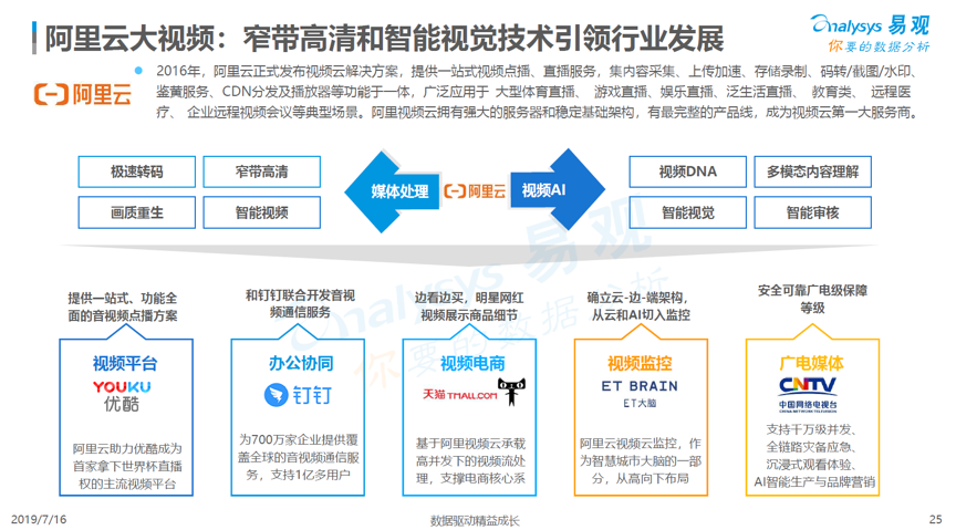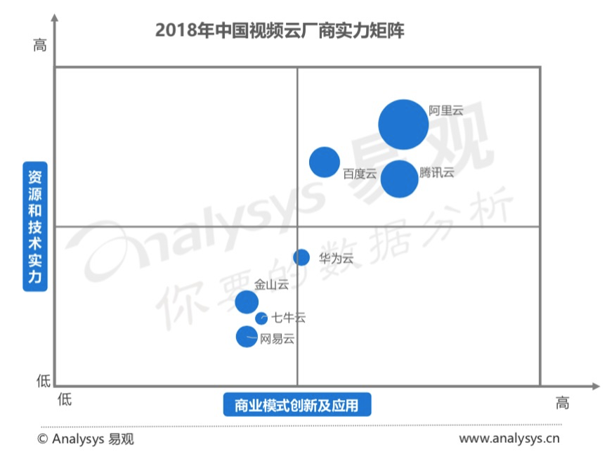 根据中国领先的大数据公司易观发布的《2019年中国视频云行业专题分析》报告,阿里云在资源技术、商业创新与市场份额三个分析维度全面领先,成为中国最具实力的视频云厂商。