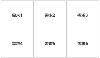 比如把下图的大矩形比作一个需求方案,小正方形比作拆解的需求点,那么这样的形式来描述这个需求就不符合MECE原则,因为三个小正方形之间有交叉重叠部分,且组合起来没有完全填满整个矩形。