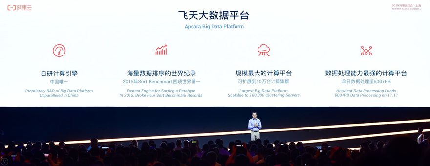 首先,大数据计算的能力。阿里云发布的飞天大数据平台,是中国唯一自主研发的大数据计算引擎,单一引擎可将10万台服务器合为一体,也是全球集群规模最大的计算平台,单日数据处理量超过 600PB。