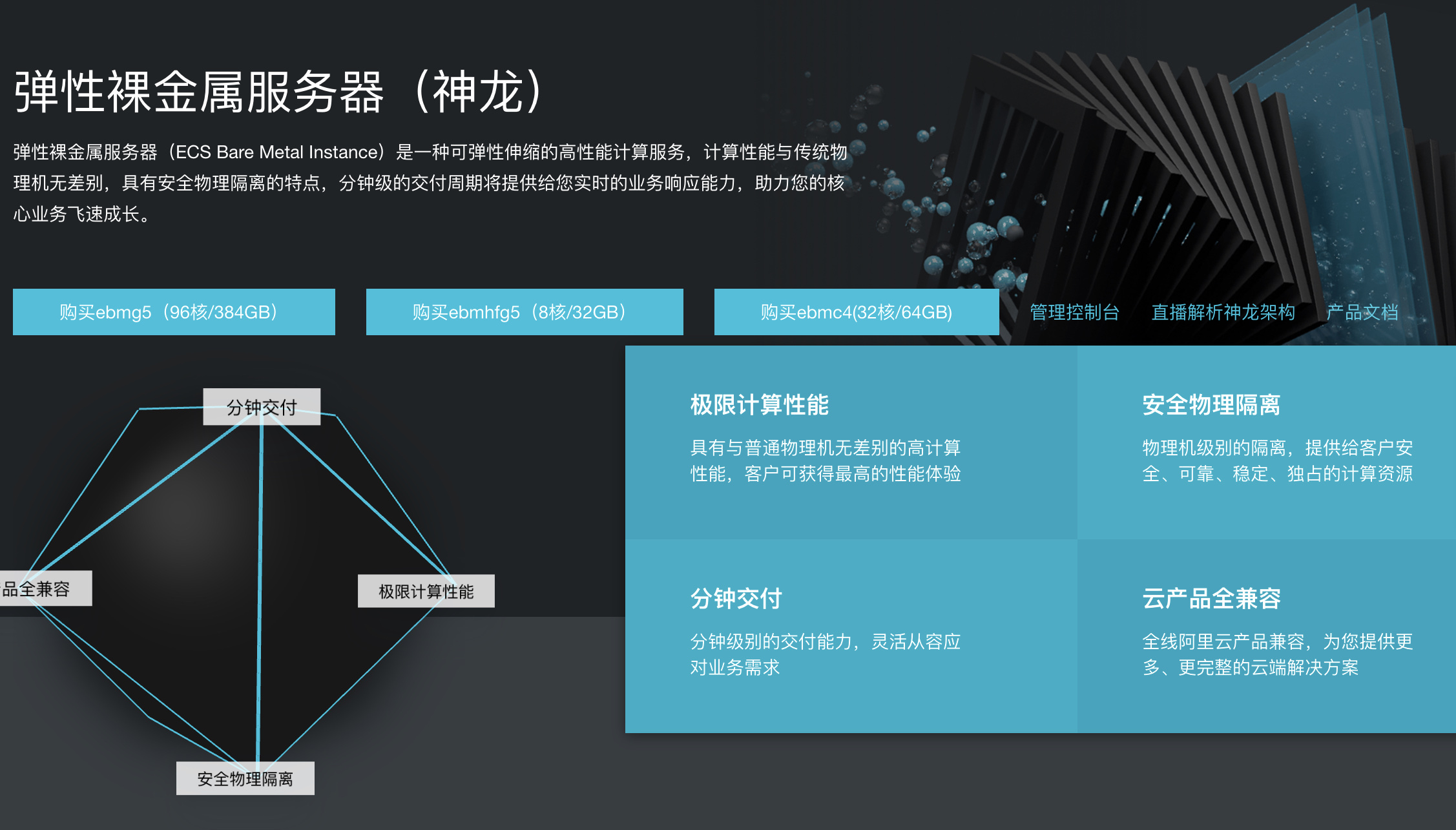 以服务器来看,云服务器固然有其天然的优势,但在某些特定行业里,物理服务器的性能优势依然是首选。因此对于这些企业而言,能否有一种同时满足云服务器灵活优势与物理服务器性能优势的产品,成为他们上云的重要考量。